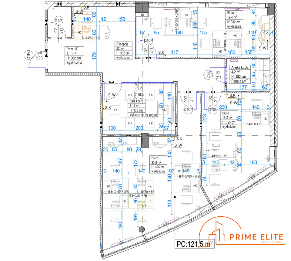- meble (biurka, fotele biurowe, stół konferencyjny, krzesła)