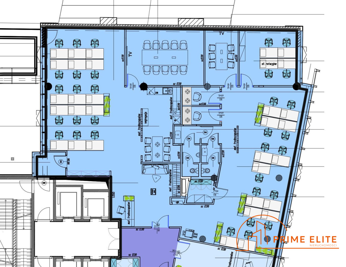 Biuro jest umeblowane, wykończone i gotowe pomieścić 33 pracowników.